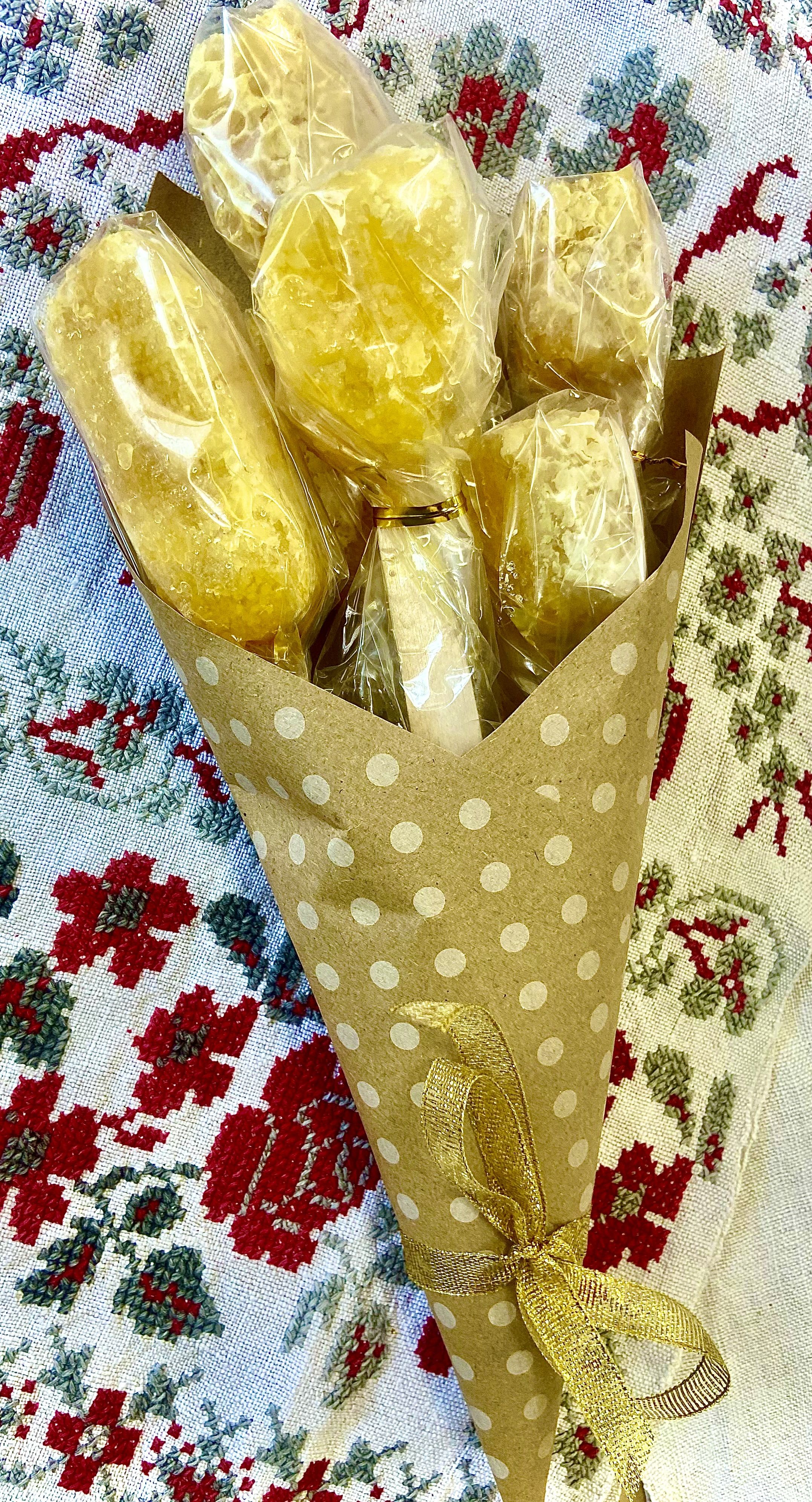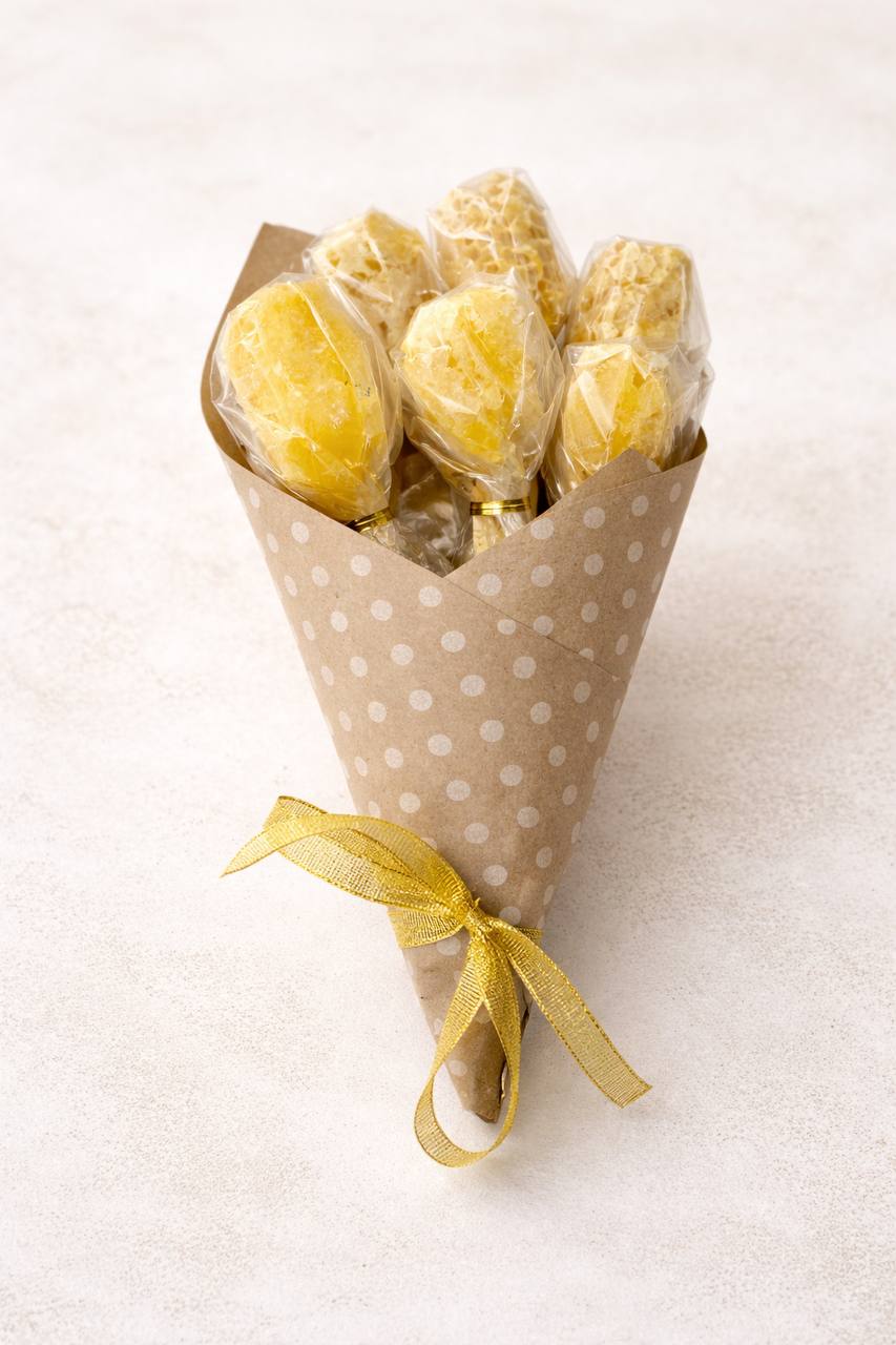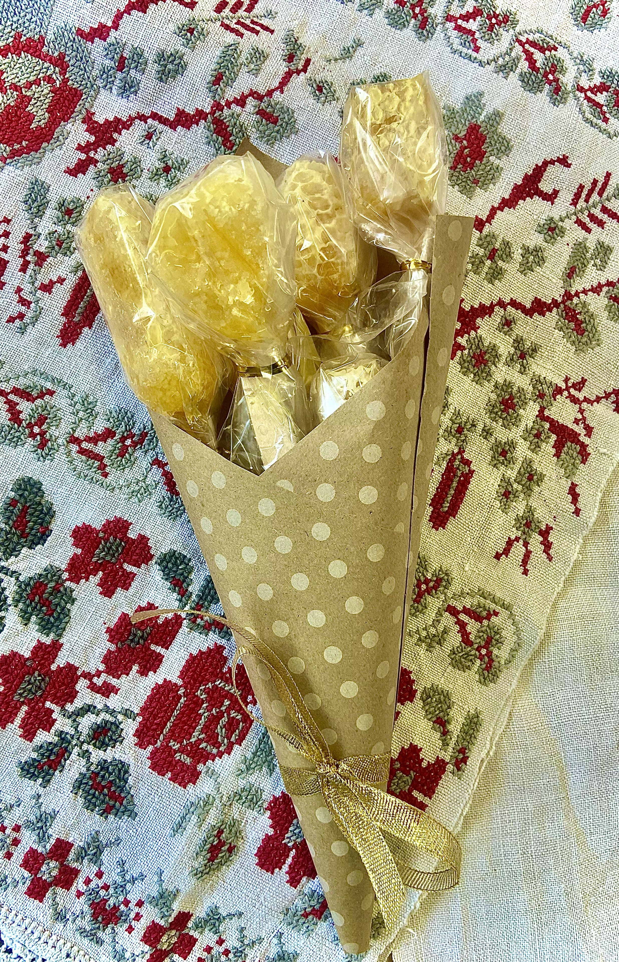 Предлагаем вашему вниманию букет из сотового меда ( 3 ложки) с индивидуальными ложками из дерева. Оформлен стильно, необычно, воспринимается позитивно. Дарится коллегам, мамам, бабушкам, как забота о близких людях, с пожеланиями здоровья.
