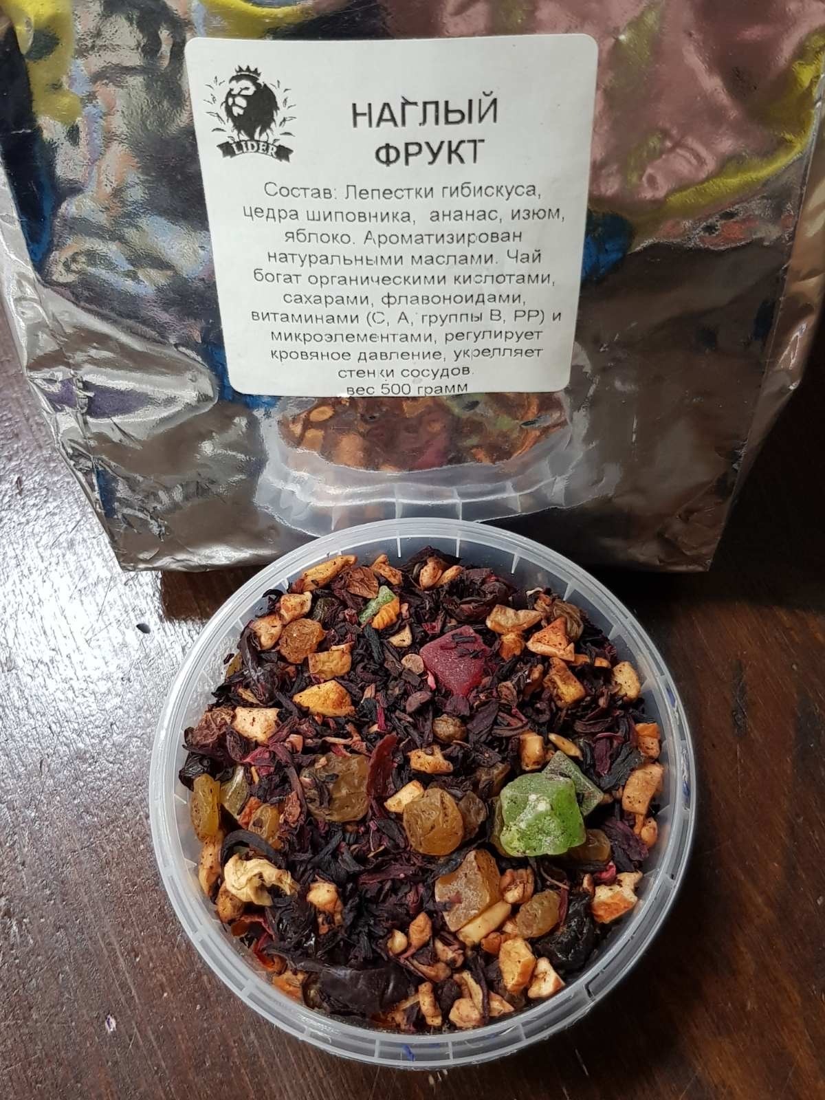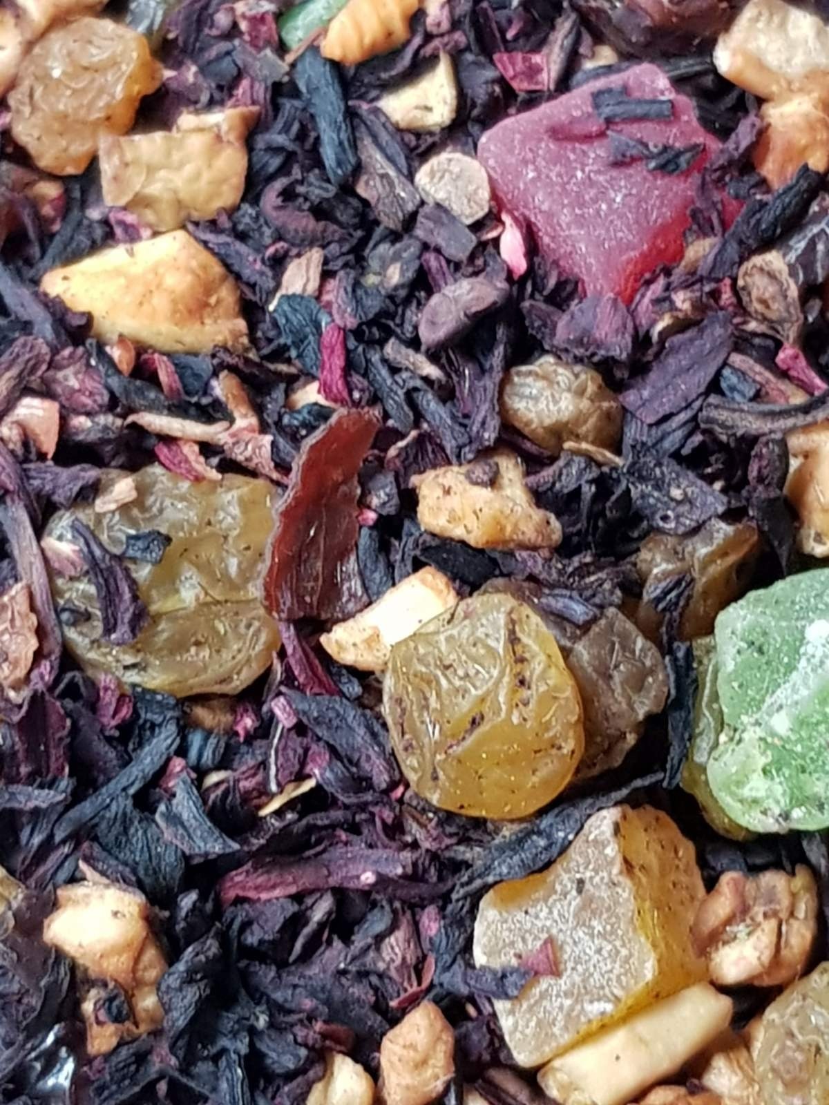 Лепестки гибискуса, цедра шиповника, ананас, изюм, яблоко.