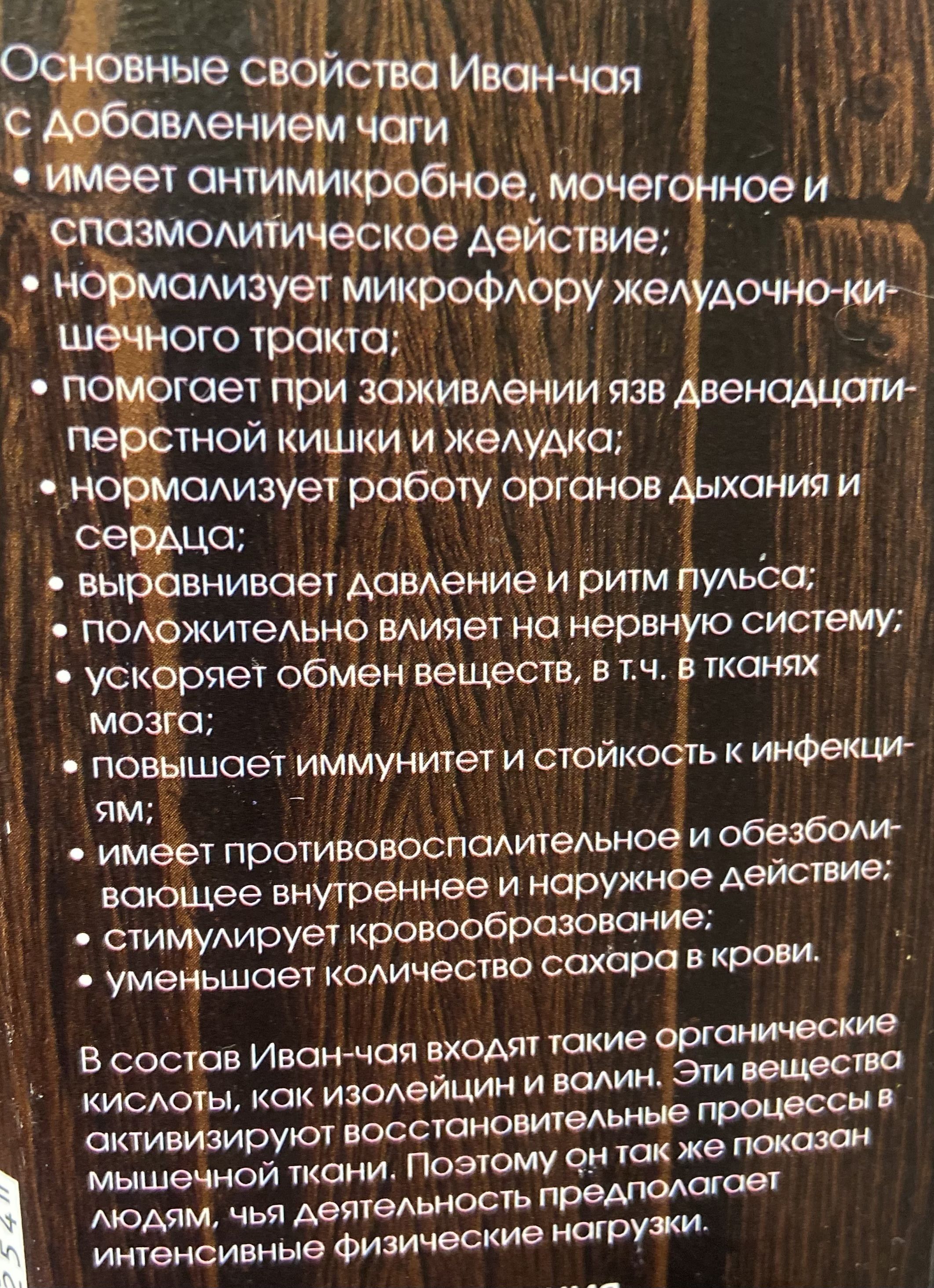 Иван-чай с добавлением чаги- это кладезь витаминов, здоровья и энергии. Он оказывает очищающее от токсинов, противовоспалительное, бодрящее и общеукрепляющее действие на весь организм. Отлично подойдет для восстановления организма после активных физических и умственных нагрузок, придаст сил. Также чай с чагой рекомендован для профилактики такой деликатной проблемы, как мужская импотенция. Состав: листья и соцветия кипрея узколистного гранулированные, ферментированные с добавлением чаги ПОЛЕЗНЫЕ СВОЙСТВА чая:- содержит более 140 биологически активных веществ. И такие микроэлементы как: марганец, серебро, цинк, медь и д.р.- Известен своим мощным терапевтическим воздействием на организм при нарушениях, связанных с функционированием нервной системы.- Чай из этого растения помогает нормализовать работу всех систем организма, выделения желчи, повысить аппетит, нормализовать работу обмена веществ организма. .В состав Иван-чая входят органические кислоты: изолейцин и валин. Эти вещества активизируют восстановительные процессы в мышечной ткани. Поэтому он так же показан людям, чья деятельность предполагает интенсивные физические нагрузки. Иван-чай с чагой имеет насыщенный неповторимый вкус и аромат, и приятно влияет на настроение.