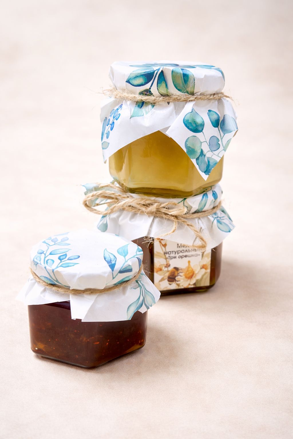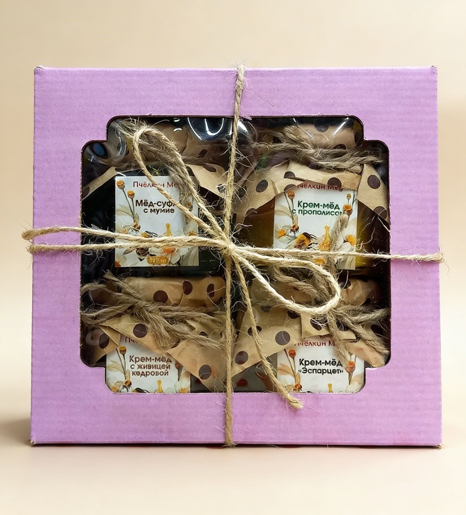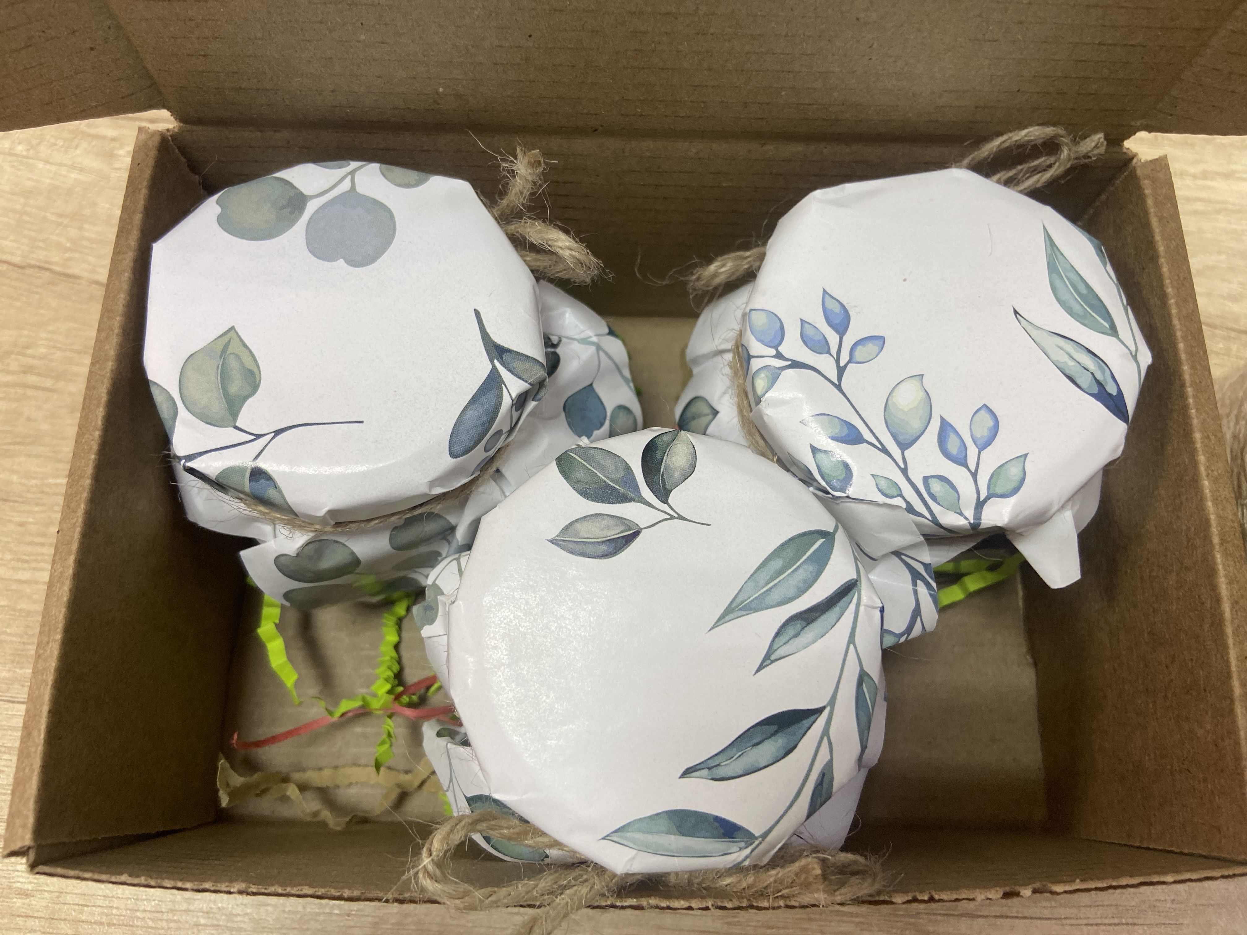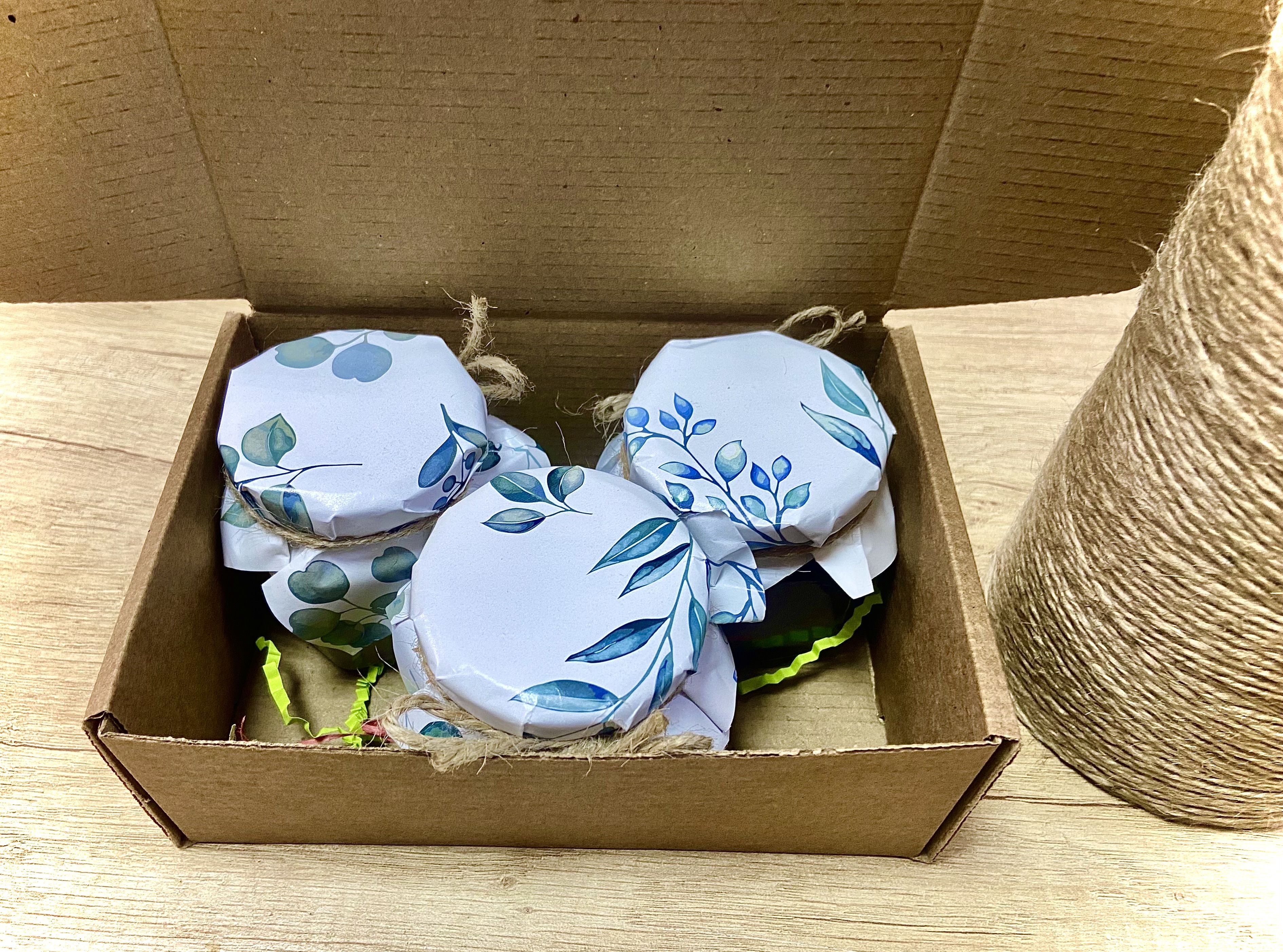 Все 3 баночки упакованы в крафт-коробку, которая завязывается бантом из натуральной прочной нити.