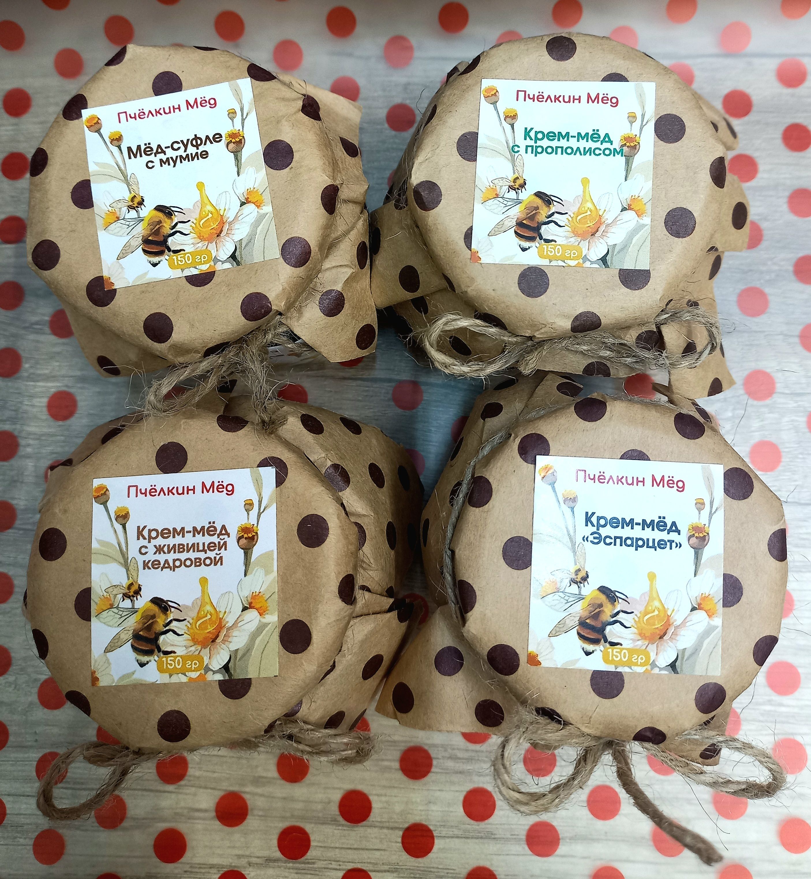 Каждая баночка наполнена крем-медом с любовью, на ней есть этикетка со выходными данными и соответствующим названием.