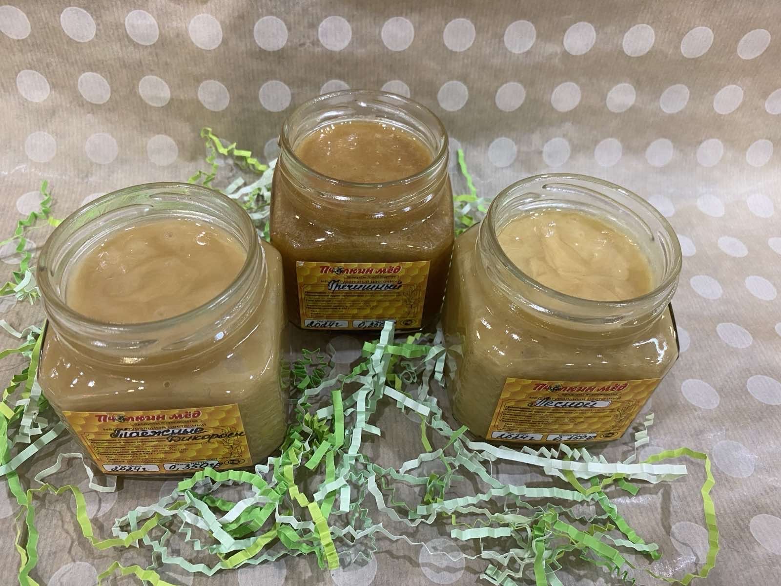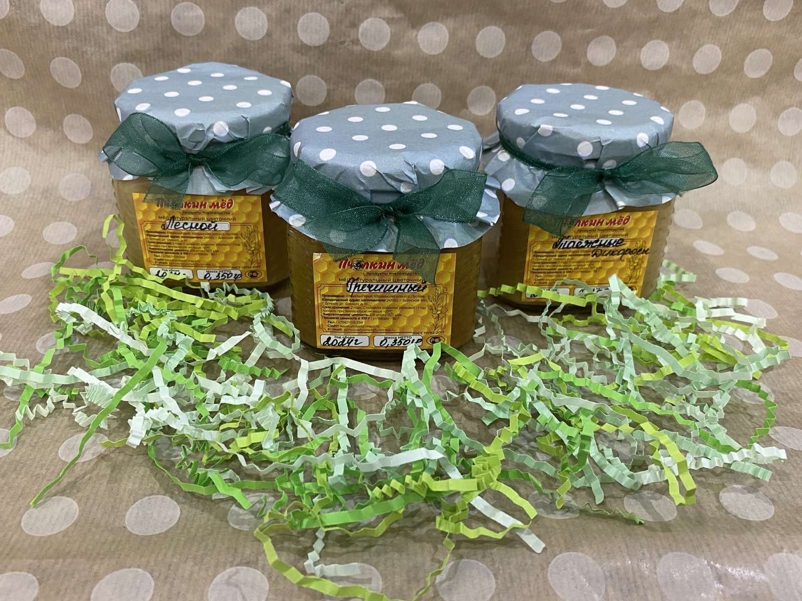 Три сорта меда в стеклянных баночках - шестигранниках или квадратах бережно упакованы в крафт коробочку, которая завязана бантом. Прекрасный добрый подарок , да и для своего здоровья великая полезность!