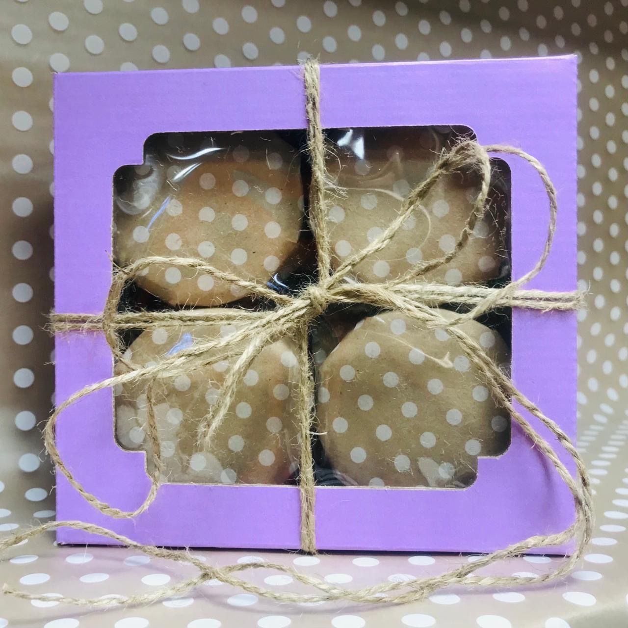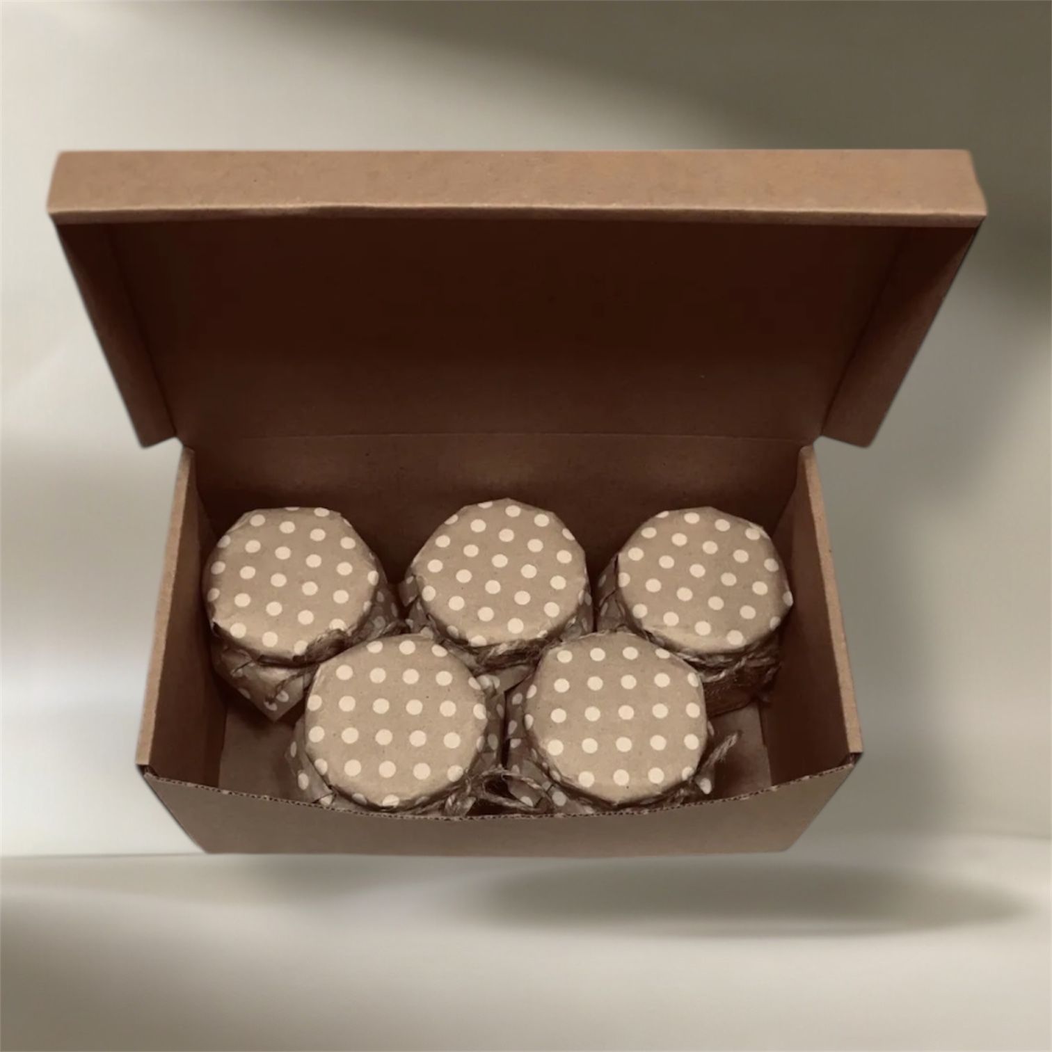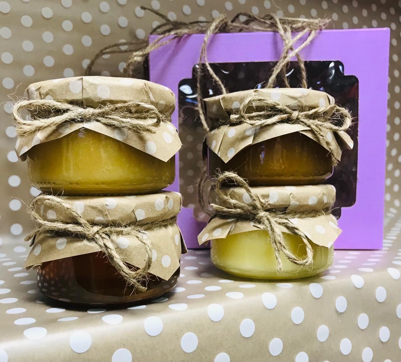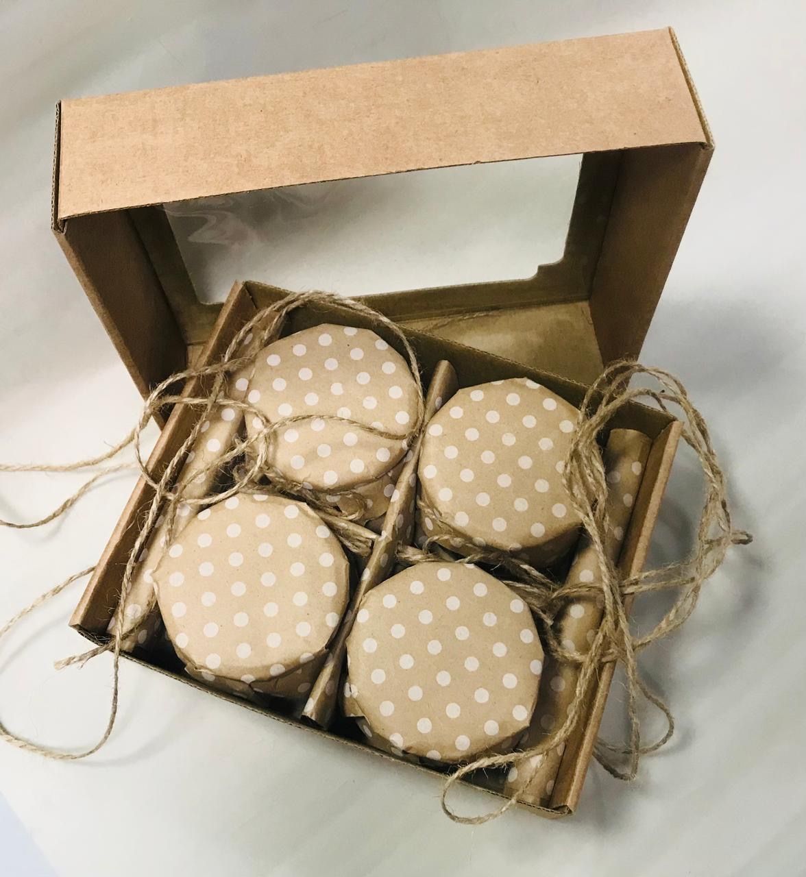 Баночки уложены в коробку с окошком , завязанную подарочным бантом, либо натуральной нитью ; цвет коробки может варьироваться от крафт, до сиреневого, салатового и других цветов .