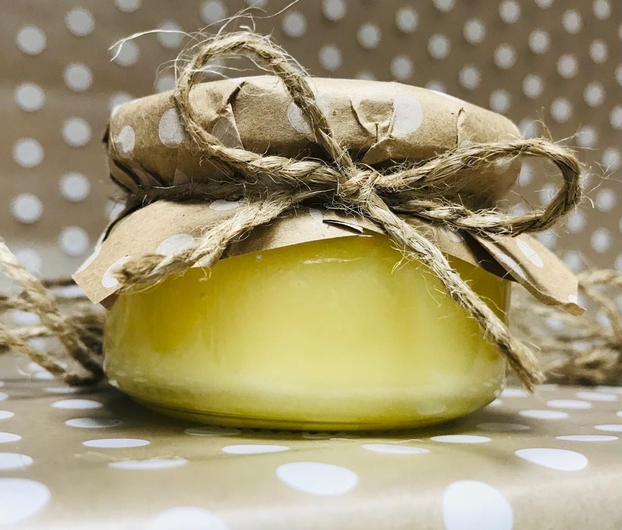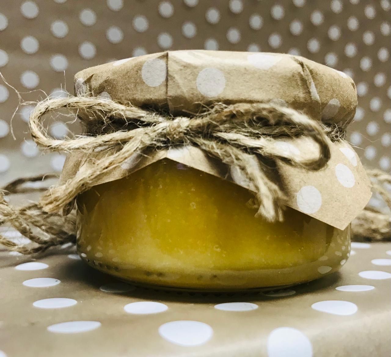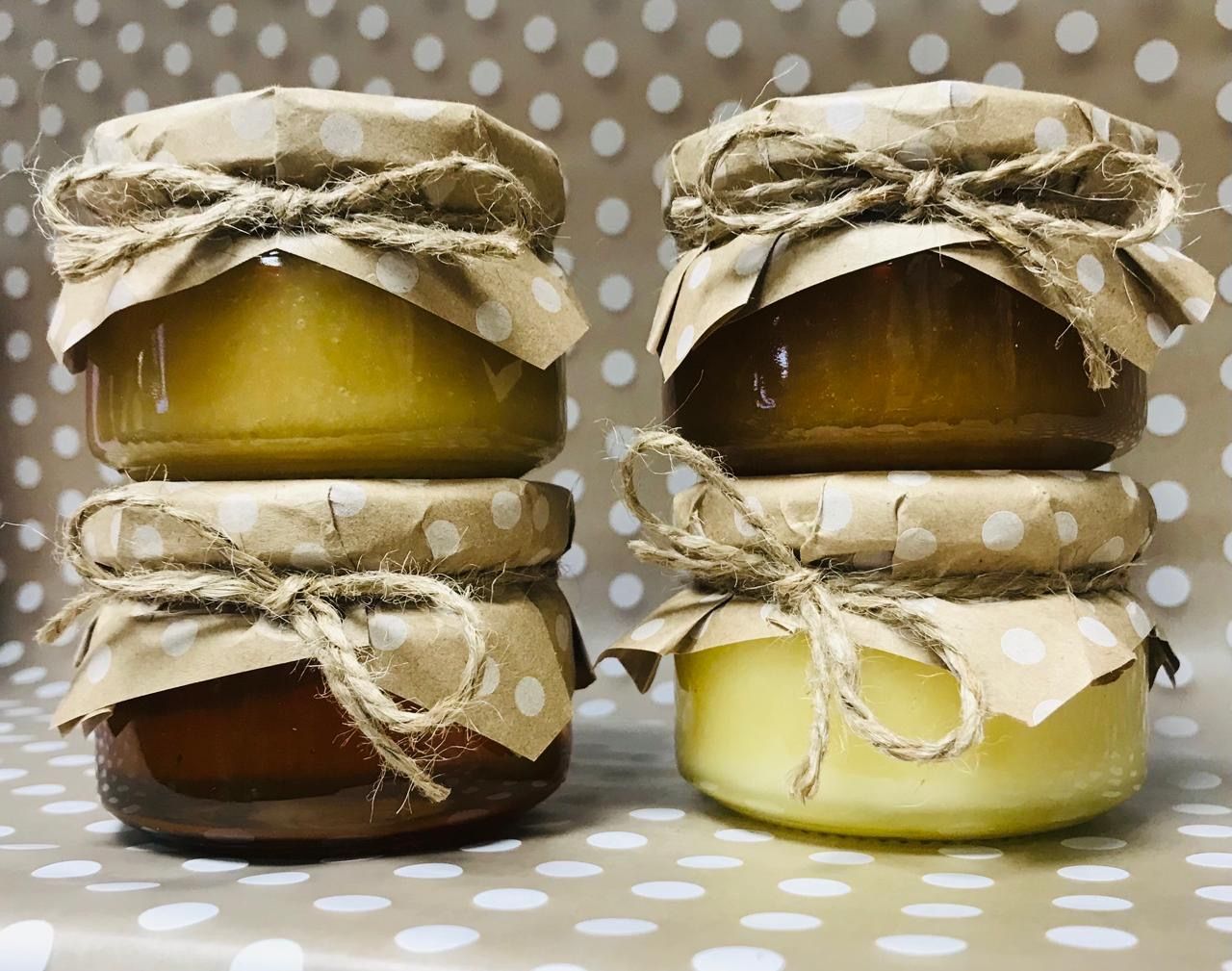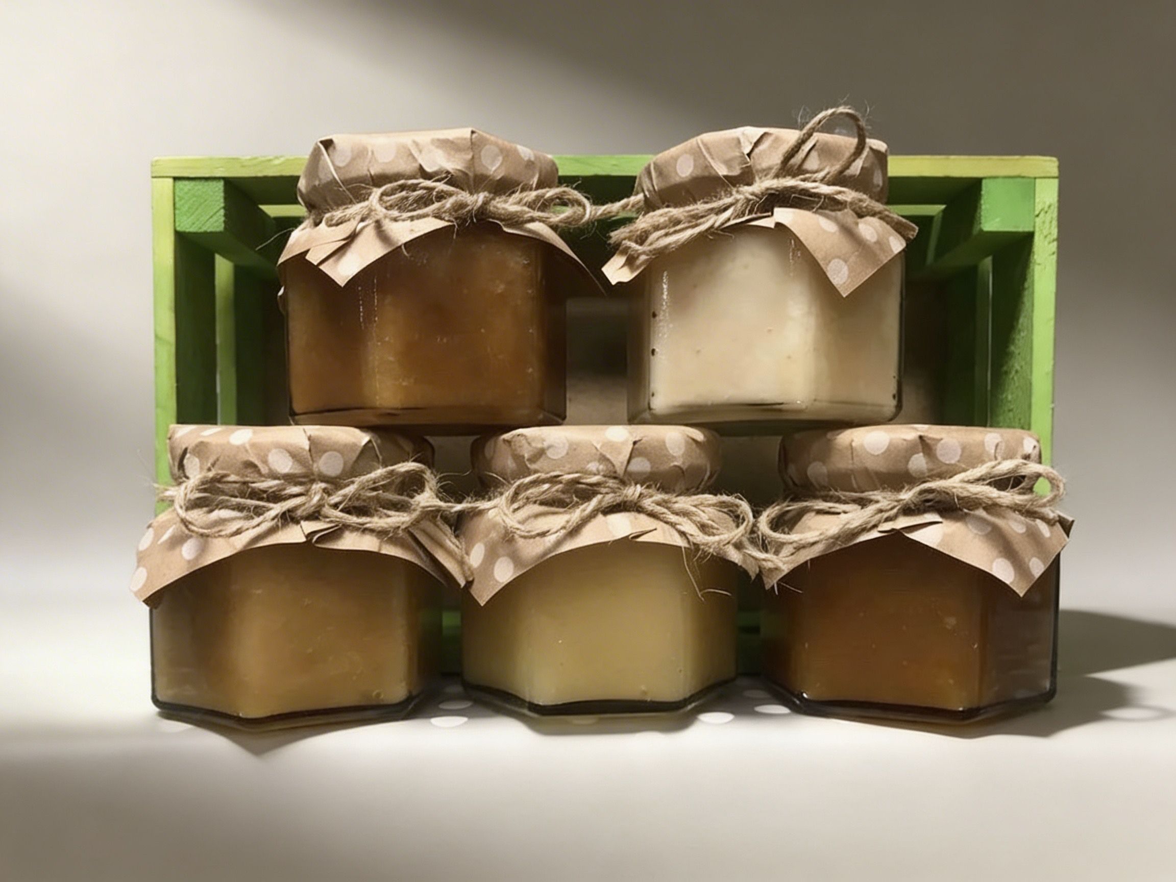 Баночки уложены в коробку с окошком , завязанную подарочным бантом, либо натуральной нитью ; цвет коробки может варьироваться от крафт, до сиреневого, салатового и других цветов .